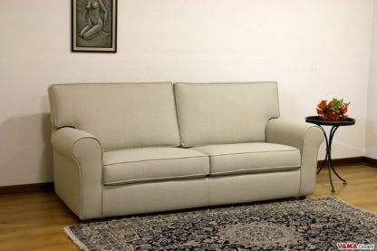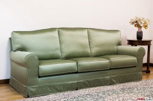 Un divano in stile classico con braccioli tondi e gonna personalizzabile in ogni dettaglio e dimensione.