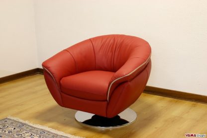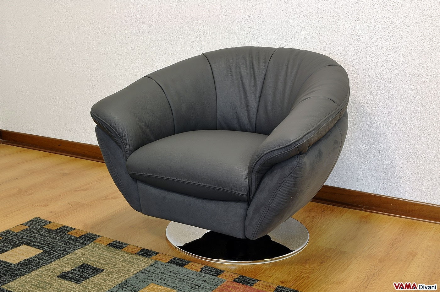 La base di questa poltrona moderna si compone di un ampio piatto in acciaio cromato grazie al quale la poltrona è perfettamente girevole.