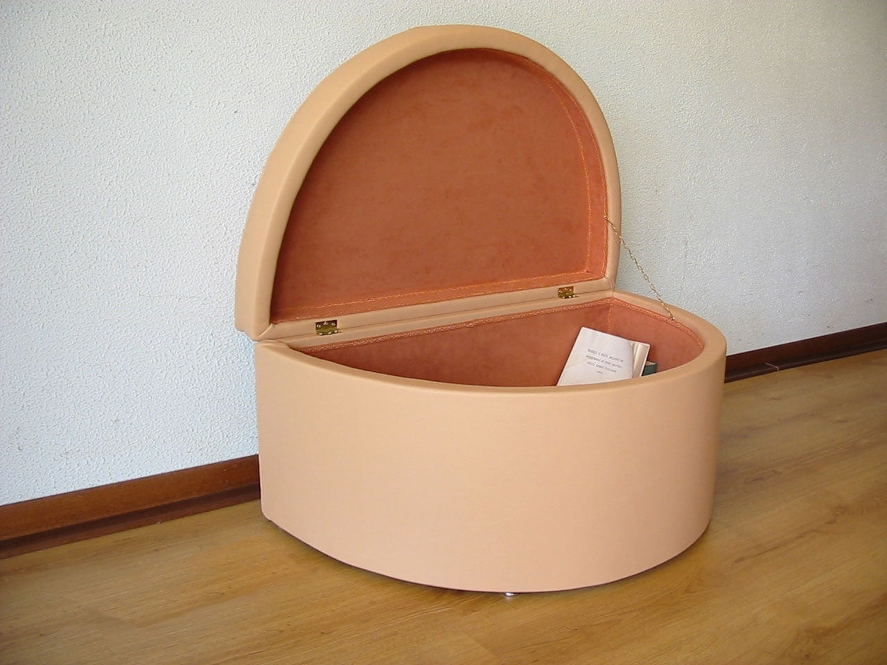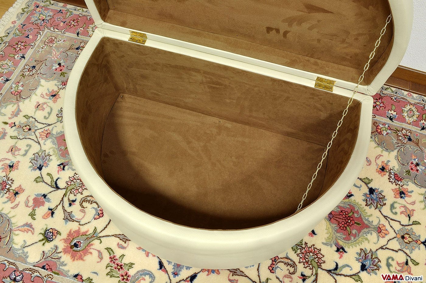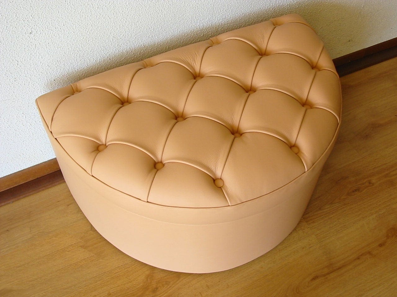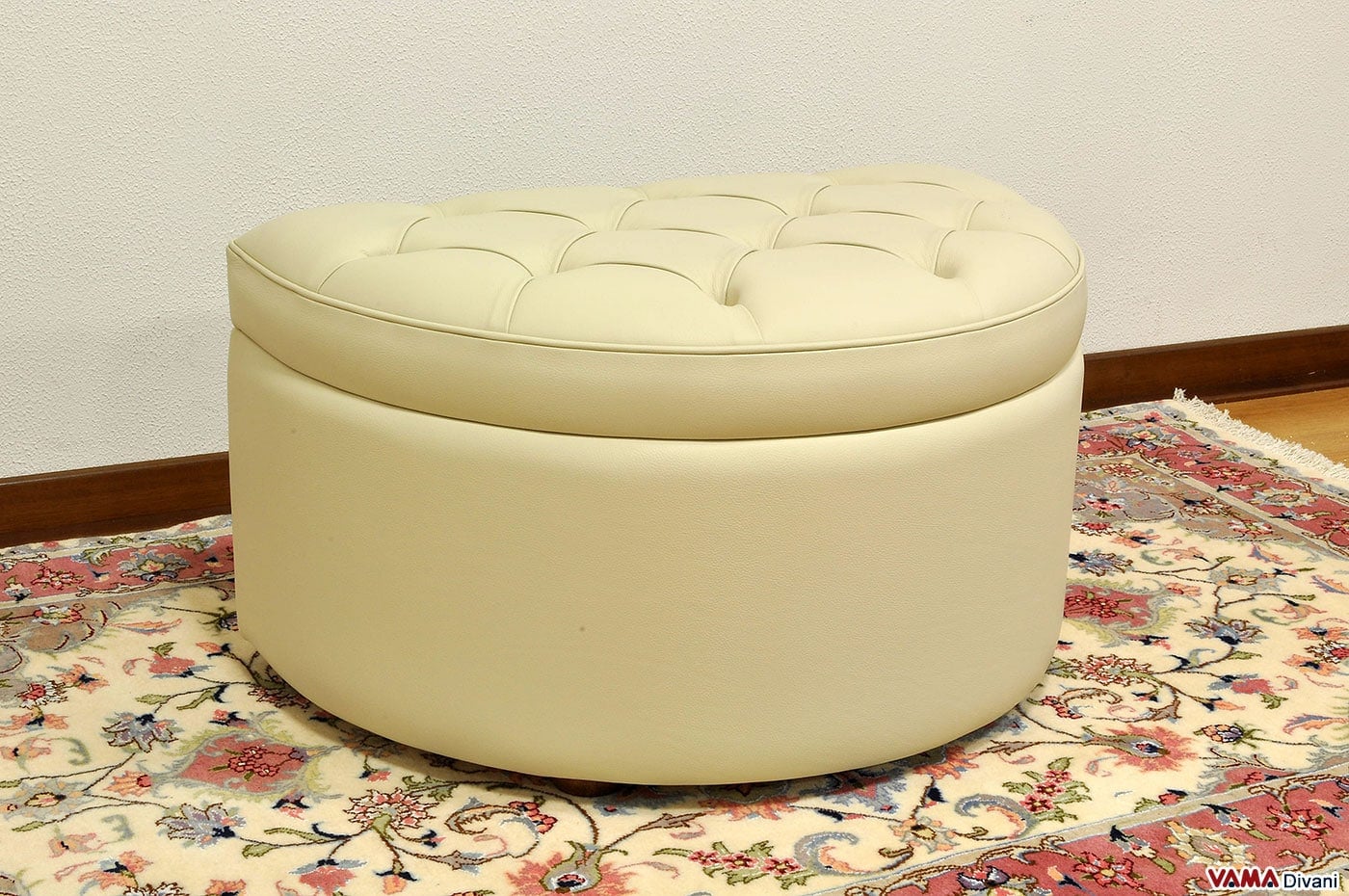 Questo pouf mezzo tondo è esteticamente impeccabile e su richiesta può essere realizzato anche su misura e senza il vano contenitore interno.