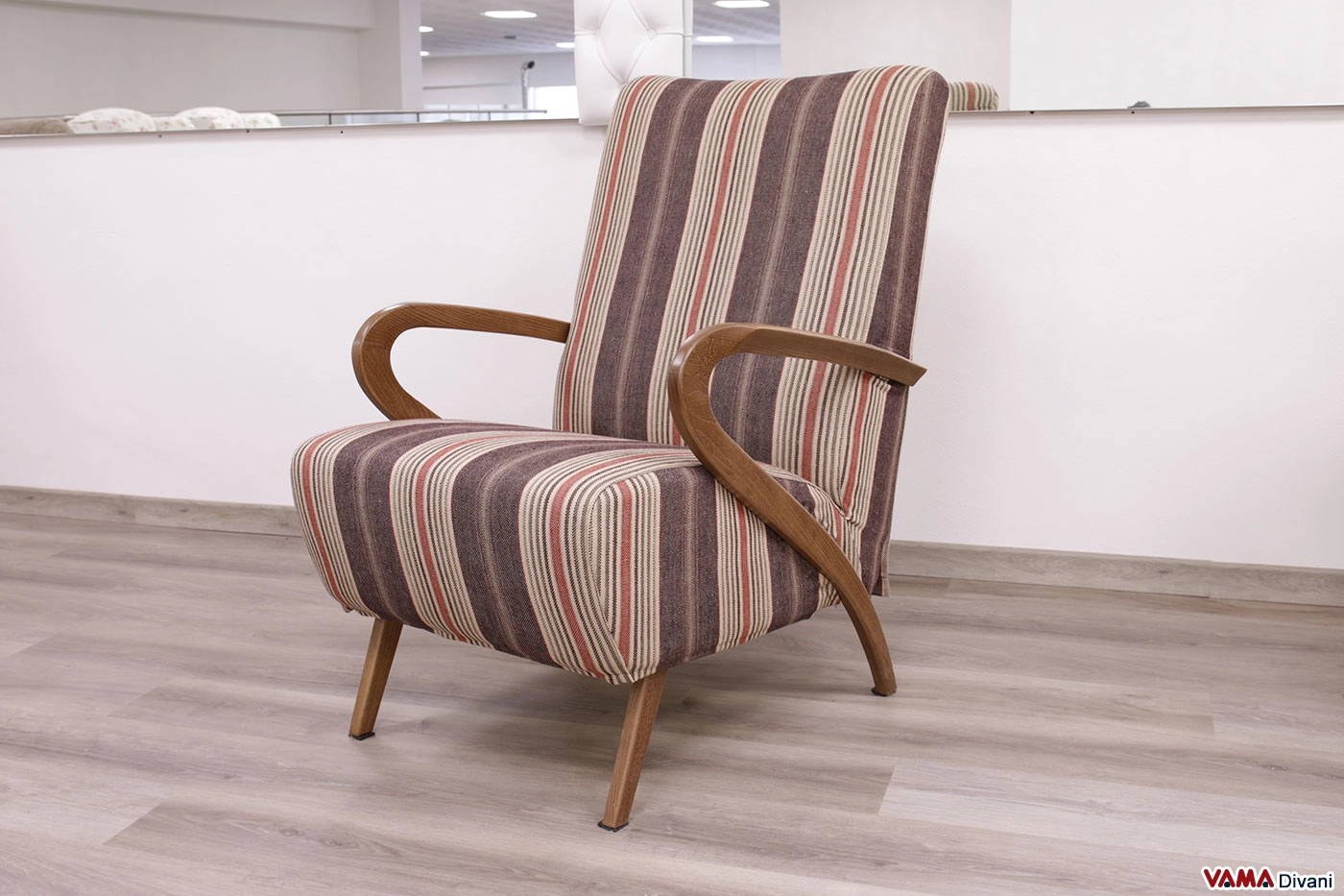 Poltrona che riprende uno stile mai passato di moda, molto confortevole nella seduta. Il bracciolo in legno collegato al piedino la rende unica nel suo genere. Il tessuto di rivestimento è sfoderabile.