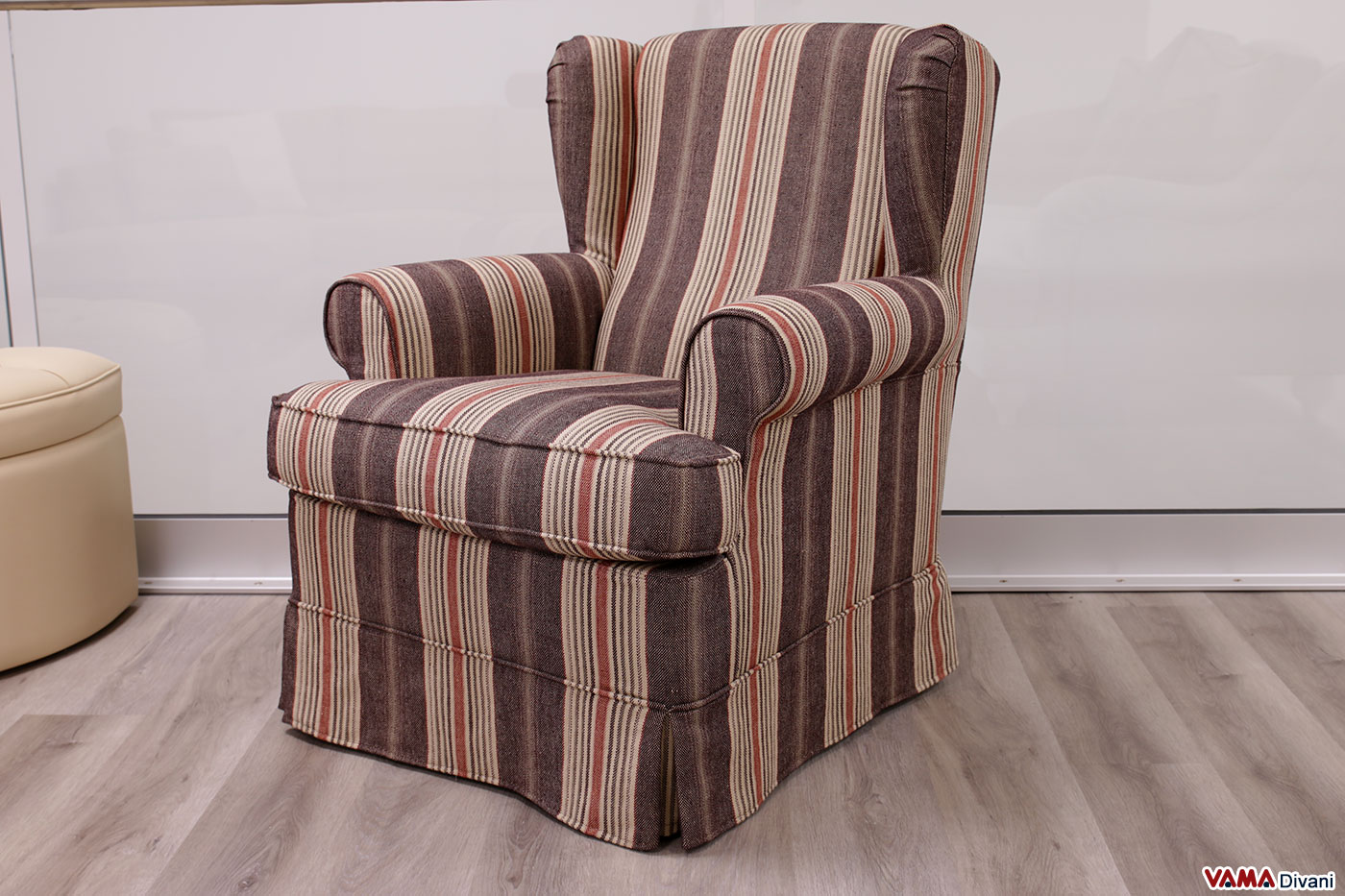 Una piccola poltrona in stile classico realizzata in tessuto sfoderabile a righe. Una poltrona bergere di piccole dimensioni che si adatta in ogni ambiente.